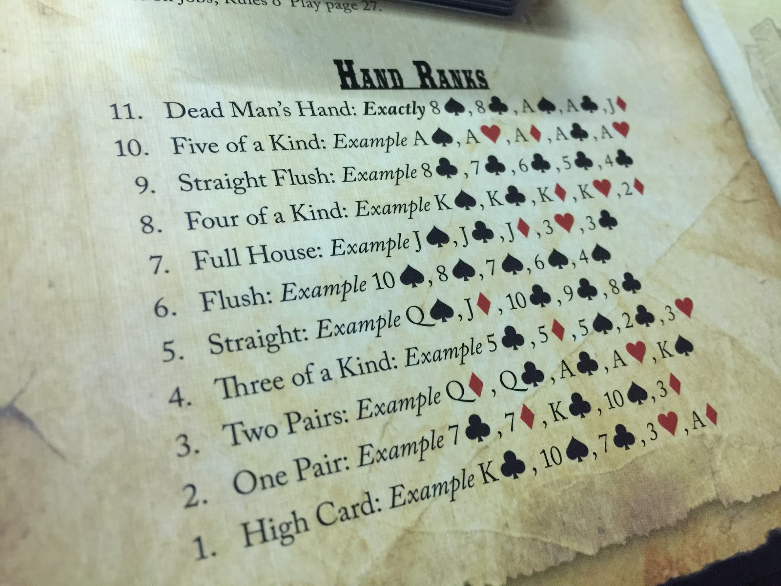 2. ลำดับไพ่แบบไหนชนะแบบไหนให้ดูที่ Hand Ranks บนแผ่น playmat ที่มุมซ้ายล่างเท่านั้น